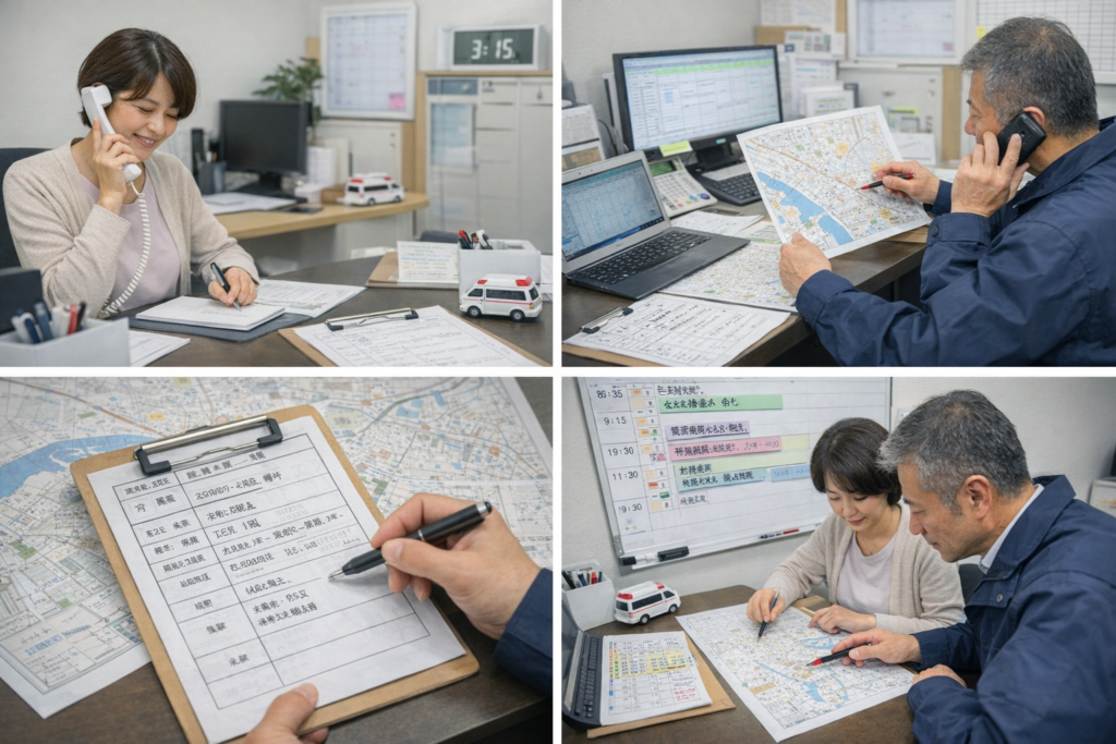 ドライバーは事前に搬送内容を確認し、患者様の状態に応じた機材や介助体制を整えてお迎えに伺います。